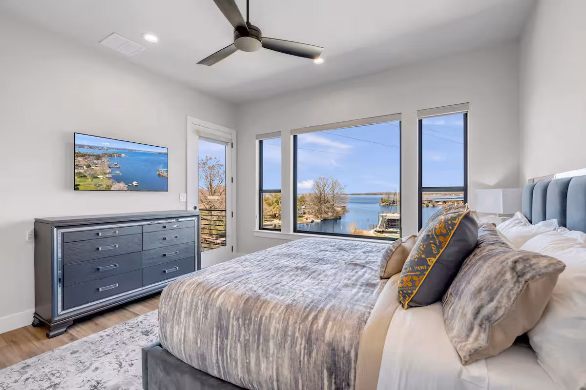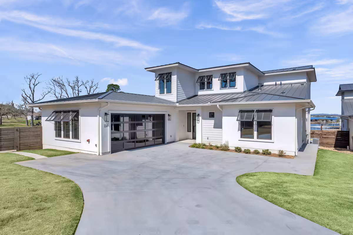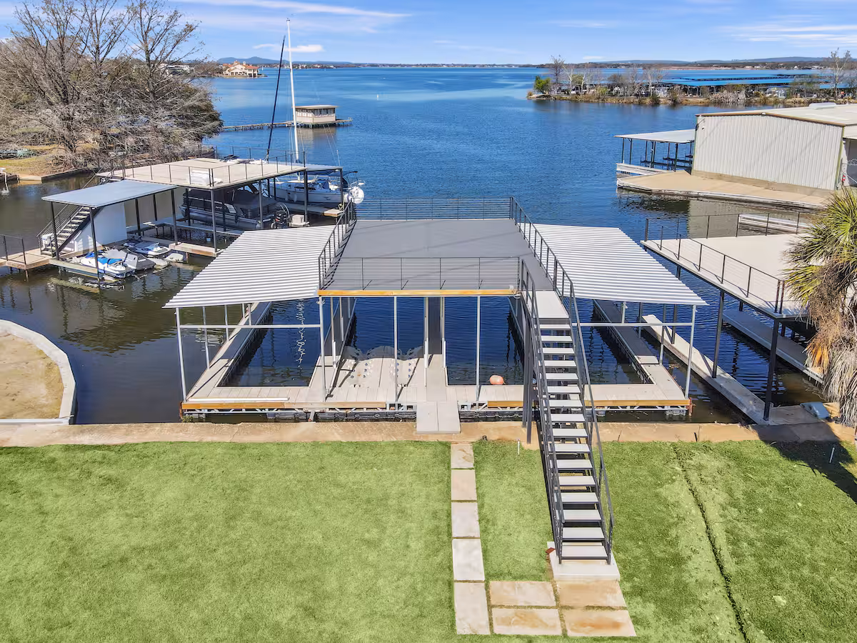 Captain’s Cove Retreat is a spacious 4 bed/5 bath waterfront vacation home on Lake LBJ in Horseshoe Bay that offers concierge services. This gorgeous home has two living areas, a well-equipped, high-end kitchen, loads of outdoor entertaining space, game room, private swimming pool with hot tub, and kayaks for guest use. A covered boat dock with rooftop sundeck provide lake access.