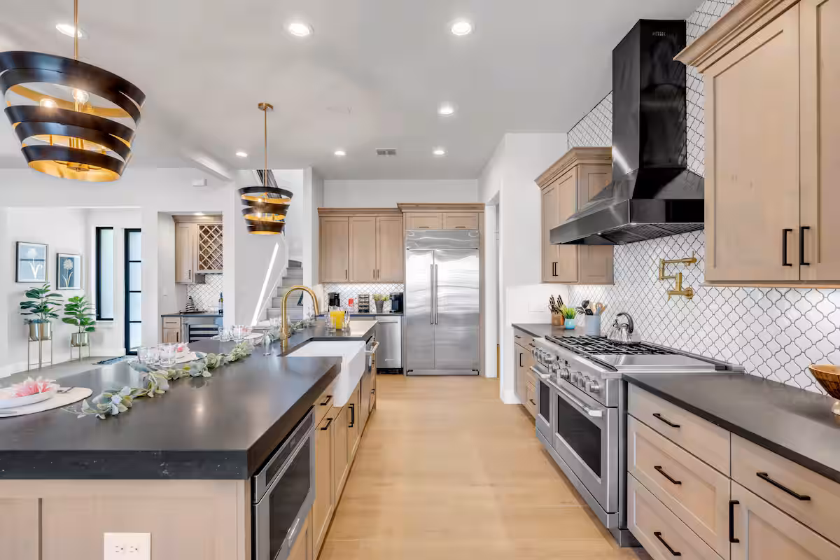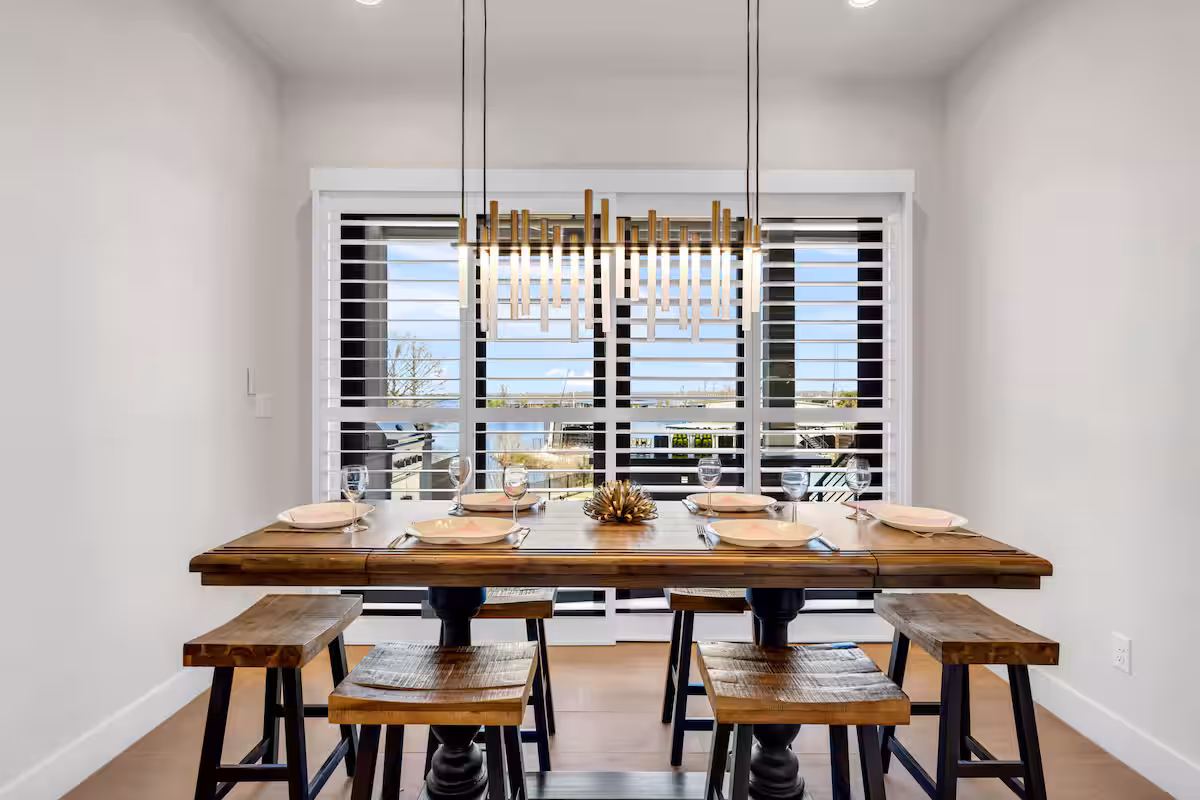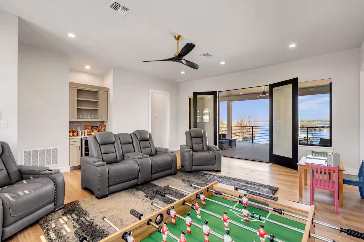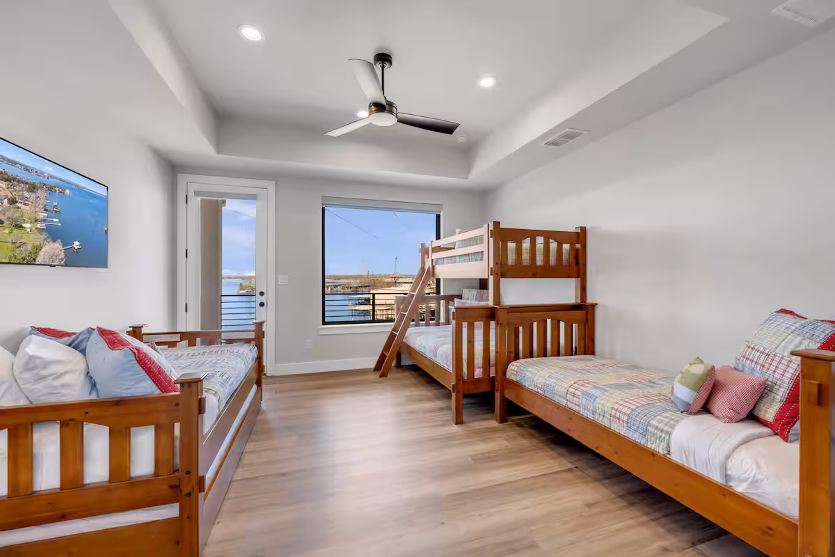 Captain’s Cove Retreat is a spacious 4 bed/5 bath waterfront vacation home on Lake LBJ in Horseshoe Bay that offers concierge services. This gorgeous home has two living areas, a well-equipped, high-end kitchen, loads of outdoor entertaining space, game room, private swimming pool with hot tub, and kayaks for guest use. A covered boat dock with rooftop sundeck provide lake access.