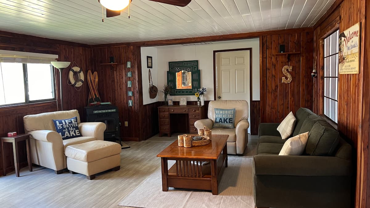 Come enjoy some R&R on beautiful Inks Lake! This charming 3 bedroom/2 bath cabin is perfect for a family getaway, a couples weekend, or a gathering of friends. You will have direct waterfront access to dock your boat/jet ski, float, fish or simply chill on this peaceful constant level lake. Start your day with coffee on the dock watching the sunrise and end your day with your favorite libation and a beautiful sunset. Enjoy the large backyard with plenty of room for yard games, swinging or just sitting.